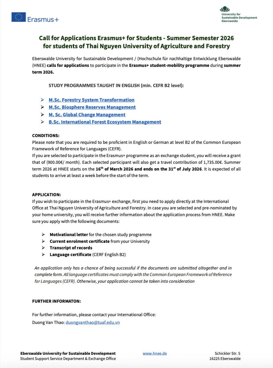 Học bổng bao gồm vé máy bay khứ hồi, chi phí ăn ở 900 EUR/tháng. Thời gian học: 16/3-31/7/2026. Điều kiện: sinh viên đang học đại học hoặc thạc sĩ tại TUAF, có ngành học phù hợp, có kết qỉa học tập tốt, tiếng Anh tối thiểu B2. Hồ sơ nộp về phòng KHCN & ĐN (Cô Giang) trước 31/10/2025.