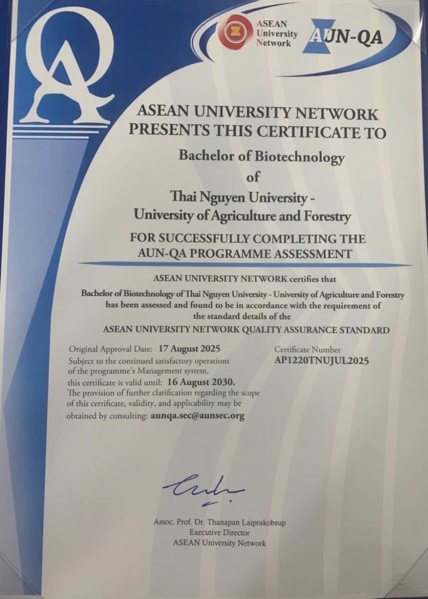 Trong khuôn khổ Lễ trao chứng nhận chương trình đào tạo đạt chuẩn AUN-QA của Đại học Thái Nguyên, ngành Công nghệ Sinh học (CNSH) thuộc Viện Công nghệ Sinh học – Công nghệ Thực phẩm (CNSH–CNTP), trường Đại học Nông Lâm - Đại học Thái Nguyên đã chính thức được Mạng lưới các trường đại học Đông Nam Á (ASEAN University Network – Quality Assurance, AUN-QA) công nhận đạt chuẩn chất lượng khu vực.