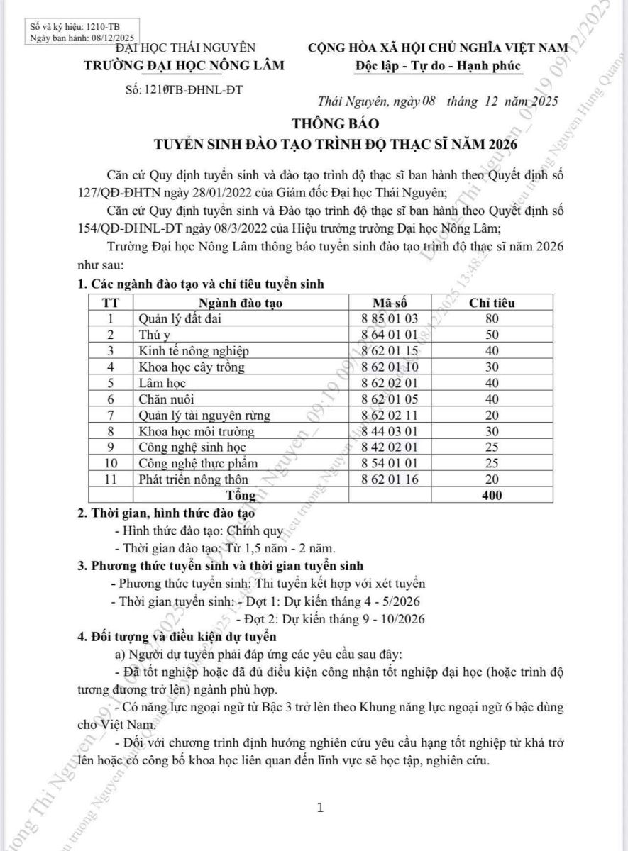 → Thông báo tuyển sinh đào tạo trình độ tiến sĩ năm 2026 - Trường Đại học Nông Lâm Thái Nguyên (12/2025)