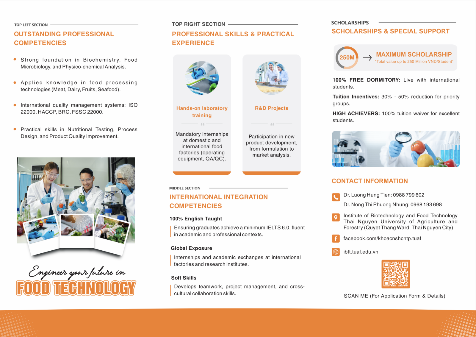 The Food Technology Engineering Program at the Institute of Biotechnology and Food Technology (IBFT), Thai Nguyen University of Agriculture and Forestry (TUAF) is the perfect choice for you!