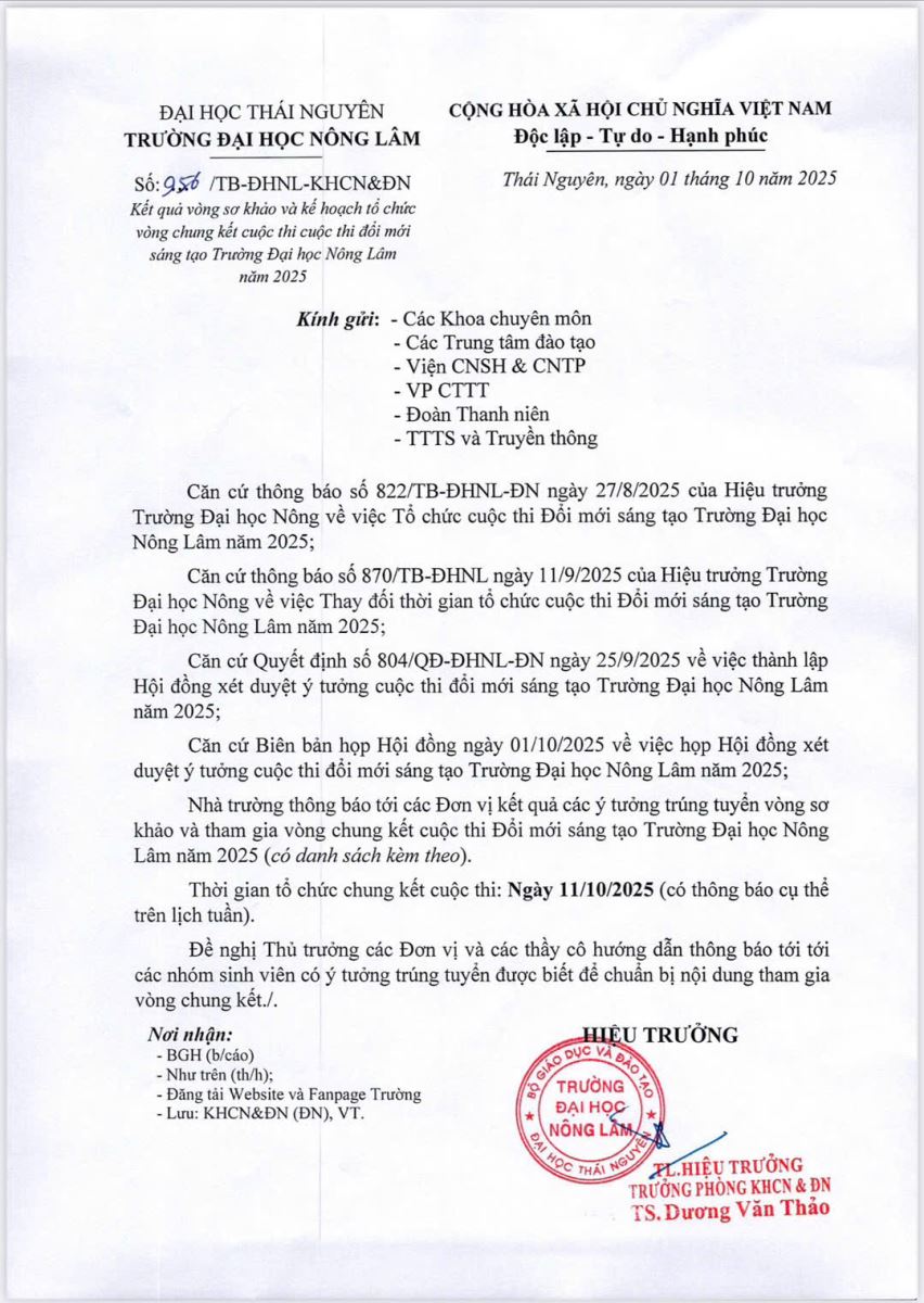 Kết quả vòng sơ khảo và kế hoạch tổ chức vòng chung kết cuộc thi đổi mới sáng tạo Trường Đại học Nông Lâm năm 2025