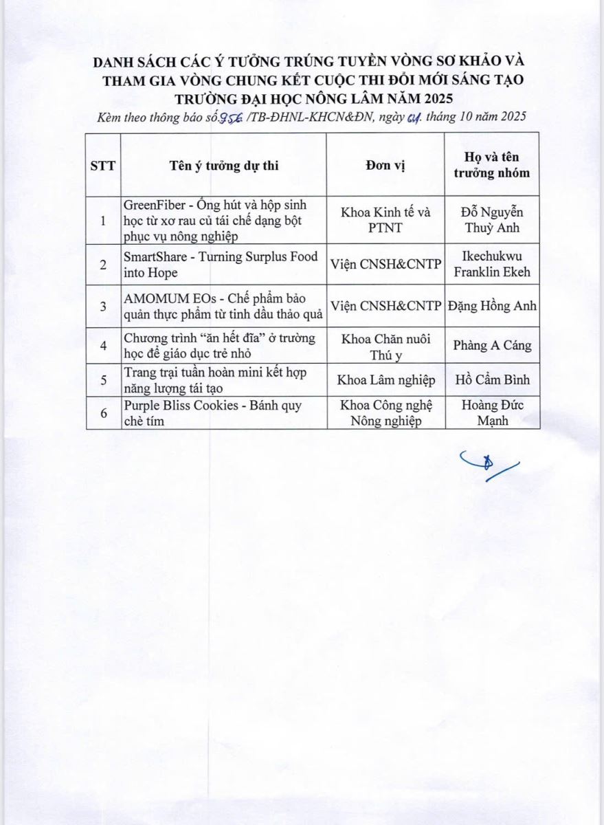 Vòng sơ loại diễn ra từ 6/9/2025 đến 28/10/2025 với 51 dự án đến từ các đơn vị trong và ngoài trường Đại học Nông Lâm. Ban tổ chức đã lựa chọn 06 dự án xuất sắc nhất vào vòng chung kết. Trong đó có 02 dự án đến từ Viện CNSH - CNTP. Chúc mừng các bạn sinh viên và thầy cô hướng dẫn. Chúc các nhóm chuẩn bị tốt 2 và đạt kết quả cao nhất tại vòng chung kết diễn ra vào ngày 11/10 tại hội trường A4.