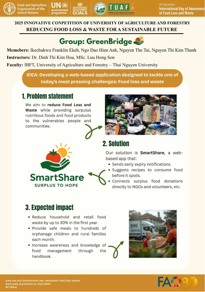 - Thúc đẩy đổi mới và sáng tạo bằng cách khuyến khích sinh viên tham gia nghiên cứu khoa học và áp dụng vào thực tiễn nhằm giảm thiểu thất thoát, lãng phí thực phẩm trong cộng đồng cũng như trong phạm vi quốc gia/khu vực.