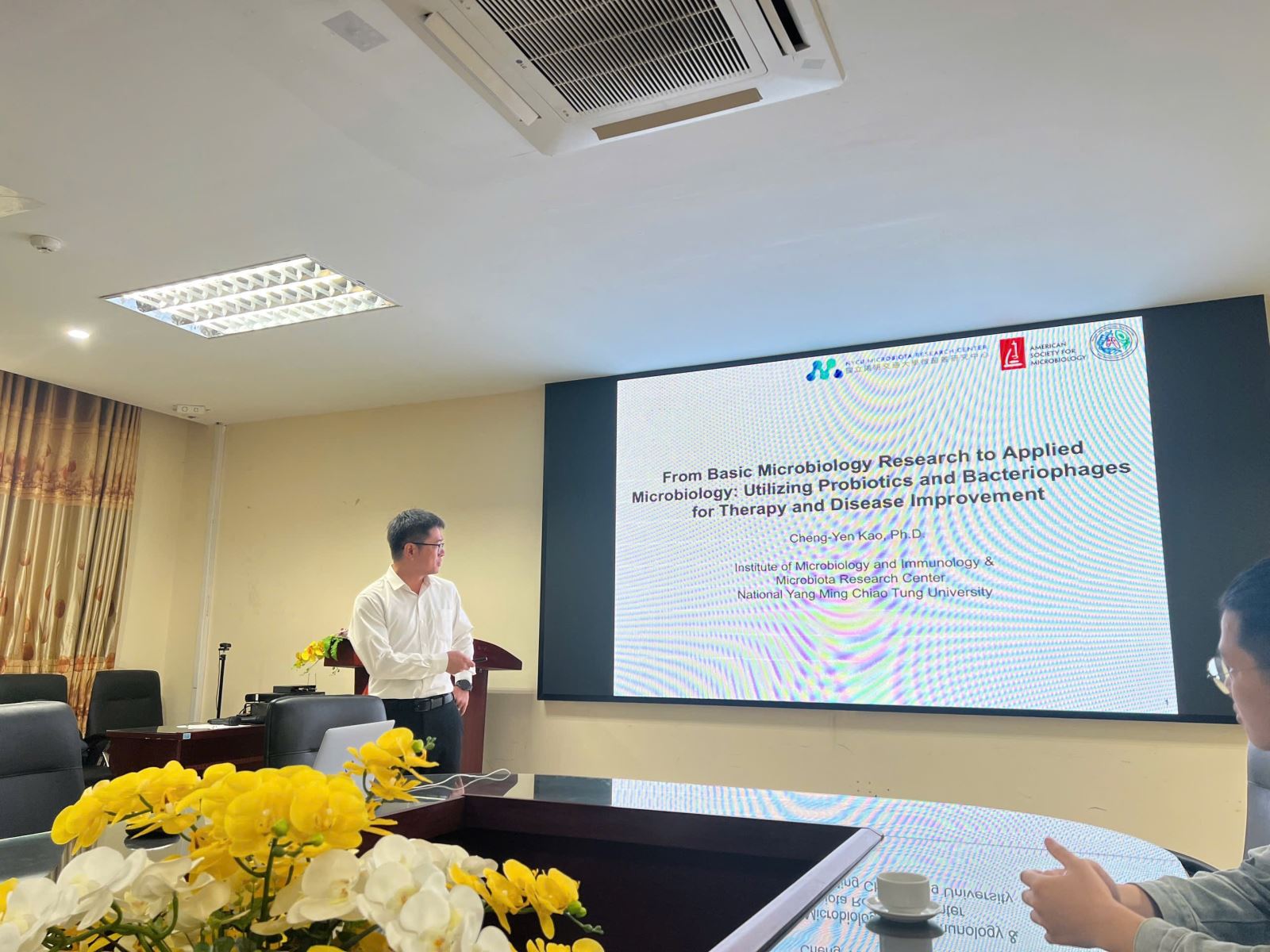 Giáo sư Cheng-Yen Kao chia sẻ bài nói chuyện học thuật với chủ đề "From Basic Microbiology Research to Applied Microbiology: Utilizing Probiotics and Bacteriophages for Therapy and Disease Improvement"